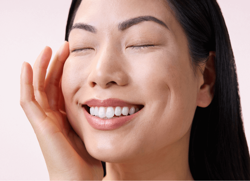 Close-up of a person touching their cheek, showing smooth skin and a neutral expression.