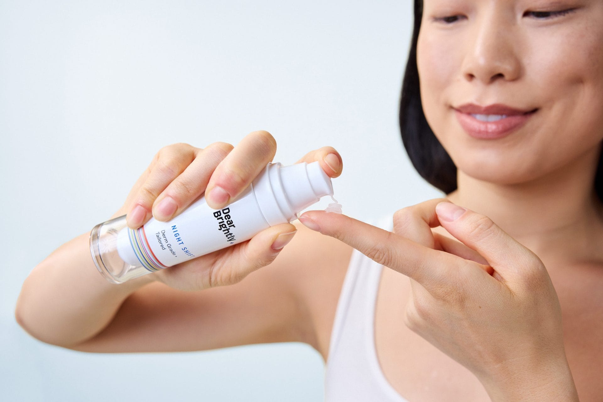 Bonus: Dear Brightly’s packaging is designed with stability in mind. Your Night Shift Rx Face Serum arrives in a light-blocking, airtight (airless) pump that protects the formula from common environmental threats.